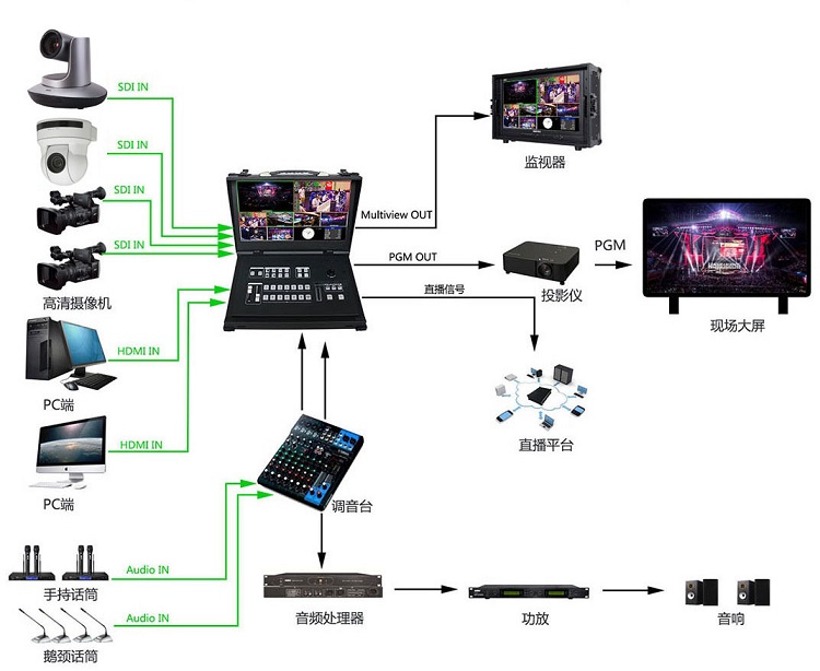 应用场景:可用于广播电视台、户外体育赛事活动、舞台节目直播、户外演出导播、新闻发布会、音视拍摄、精品教学课件制作、学术讨论交流、视频会议多方互动等录播直播导播场景,进行视频切换、转场切换等需求。