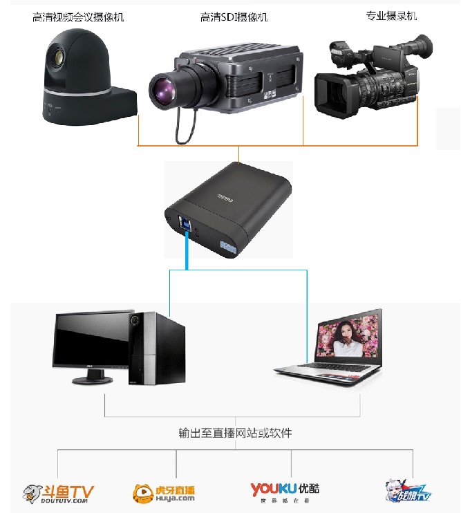 派尼珂高清USB3.0采集卡(盒)、高达360MB/s传输带宽,输出广播级画质。在视频会议推流直播、手术医疗、教育培训等领域高清图像采集直播、游戏直播等上广泛使用。高清输入输出支持1920*1080p/60fps图像。可以将HD-SDI、3G-SDI的高清视频会议摄像机、医疗高清摄像机、专业摄录机通过同轴电缆远距离传输后,转化为USB3.0的高清信号,高速3.0接口接入笔记本电脑或PC台式机上。广泛在教育直播系统、公检法审讯系统、商业直播等环境下使用。通过视频会议软件或者直播软件窗口观看高清视频图像、视频录制、推流直播、编辑高清视频信号等工作。兼容市面所有直播推流软件、视频会议软件。例如:OBS、Xsplit、虎牙等主流媒体直播软件,适用斗鱼、微吼直播、优酷、乐视、花椒、战旗等直播平台。